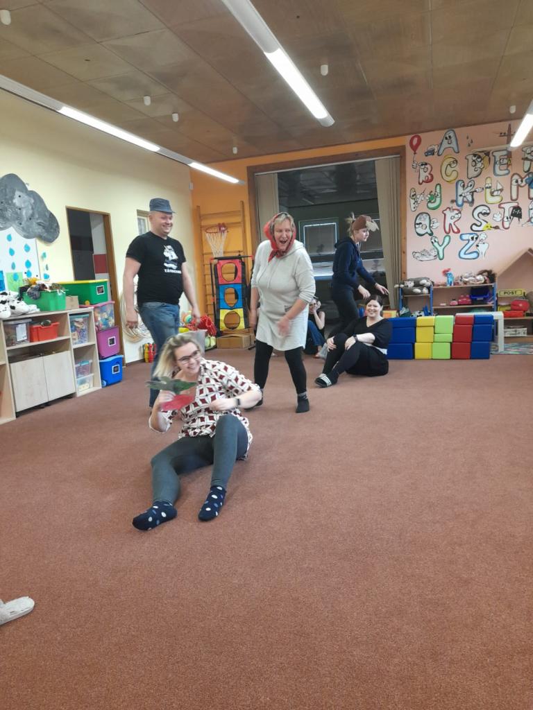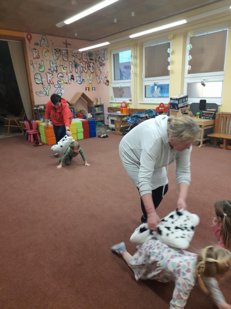 Dopoledne plné cvičení, her, tancování, zpívání a soutěžení. Po svačině ochutnávka a poznávání ovoce a zeleniny, tvoření a dramatizace pohadky.